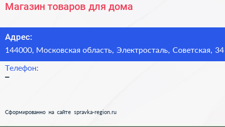 Магазин товаров для дома по адресу 144000, Московская область, Электросталь, Советская, 34 в дальнейшем Организация, размещена в следующих категориях: