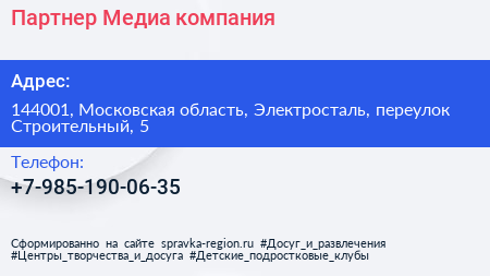 Партнер-Медиа, компания по адресу 144001, Московская область, Электросталь, переулок Строительный, 5 в дальнейшем Организация, размещена в следующих категориях: