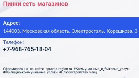 Пинки, сеть магазинов по адресу 144003, Московская область, Электросталь, Корешкова, 3 в дальнейшем Организация, размещена в следующих категориях: