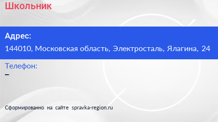 Школьник по адресу 144010, Московская область, Электросталь, Ялагина, 24 в дальнейшем Организация, размещена в следующих категориях: