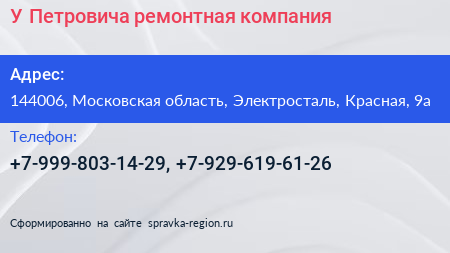 У Петровича, ремонтная компания по адресу 144006, Московская область, Электросталь, Красная, 9а в дальнейшем Организация, размещена в следующих категориях: