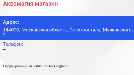 Аквамагия, магазин по адресу 144000, Московская область, Электросталь, Маяковского, 9 в дальнейшем Организация, размещена в следующих категориях: