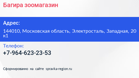 Багира, зоомагазин по адресу 144010, Московская область, Электросталь, Западная, 20 к1 в дальнейшем Организация, размещена в следующих категориях: