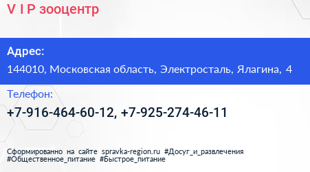 V.I.P., зооцентр по адресу 144010, Московская область, Электросталь, Ялагина, 4 в дальнейшем Организация, размещена в следующих категориях: