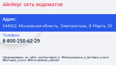 Айсберг, сеть водоматов по адресу 144012, Московская область, Электросталь, 8 Марта, 33 в дальнейшем Организация, размещена в следующих категориях: