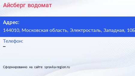 Айсберг, водомат по адресу 144010, Московская область, Электросталь, Западная, 10Б в дальнейшем Организация, размещена в следующих категориях: