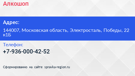 Алкошоп по адресу 144007, Московская область, Электросталь, Победы, 22 к1Б в дальнейшем Организация, размещена в следующих категориях:
