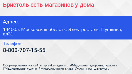 Бристоль, сеть магазинов у дома по адресу 144005, Московская область, Электросталь, Пушкина, вл31 в дальнейшем Организация, размещена в следующих категориях: