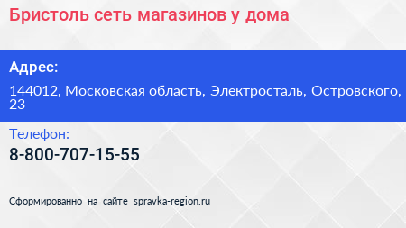 Бристоль, сеть магазинов у дома по адресу 144012, Московская область, Электросталь, Островского, 23 в дальнейшем Организация, размещена в следующих категориях: