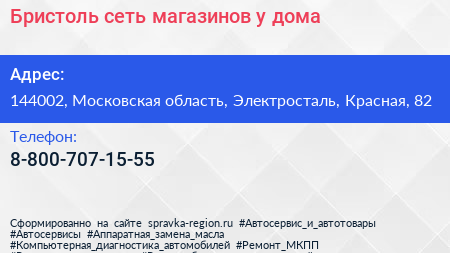 Бристоль, сеть магазинов у дома по адресу 144002, Московская область, Электросталь, Красная, 82 в дальнейшем Организация, размещена в следующих категориях: