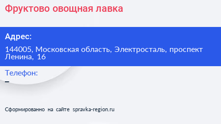 Фруктово-овощная лавка по адресу 144005, Московская область, Электросталь, проспект Ленина, 16 в дальнейшем Организация, размещена в следующих категориях: