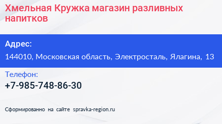 Хмельная Кружка, магазин разливных напитков по адресу 144010, Московская область, Электросталь, Ялагина, 13 в дальнейшем Организация, размещена в следующих категориях: