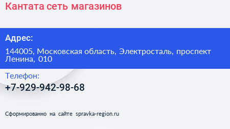 Кантата, сеть магазинов по адресу 144005, Московская область, Электросталь, проспект Ленина, 010 в дальнейшем Организация, размещена в следующих категориях: