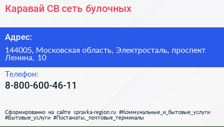 Каравай СВ, сеть булочных по адресу 144005, Московская область, Электросталь, проспект Ленина, 10 в дальнейшем Организация, размещена в следующих категориях: