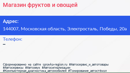 Магазин фруктов и овощей по адресу 144007, Московская область, Электросталь, Победы, 20а в дальнейшем Организация, размещена в следующих категориях: