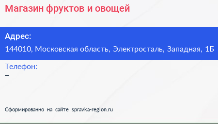 Магазин фруктов и овощей по адресу 144010, Московская область, Электросталь, Западная, 1Б в дальнейшем Организация, размещена в следующих категориях: