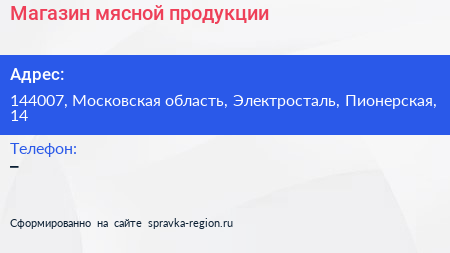 Магазин мясной продукции по адресу 144007, Московская область, Электросталь, Пионерская, 14 в дальнейшем Организация, размещена в следующих категориях: