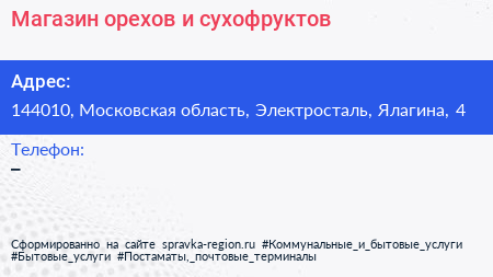 Магазин орехов и сухофруктов по адресу 144010, Московская область, Электросталь, Ялагина, 4 в дальнейшем Организация, размещена в следующих категориях: