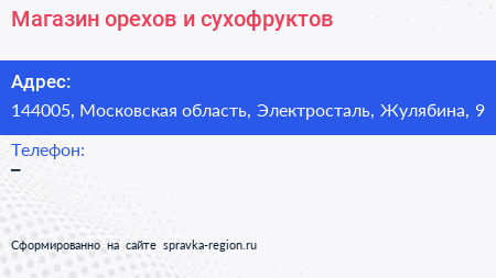 Магазин орехов и сухофруктов по адресу 144005, Московская область, Электросталь, Жулябина, 9 в дальнейшем Организация, размещена в следующих категориях: