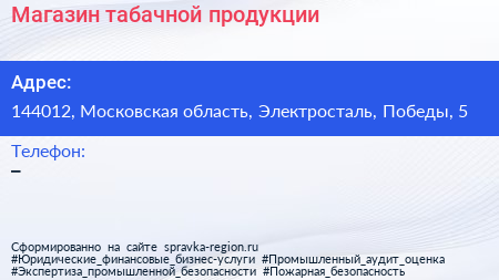 Магазин табачной продукции по адресу 144012, Московская область, Электросталь, Победы, 5 в дальнейшем Организация, размещена в следующих категориях: