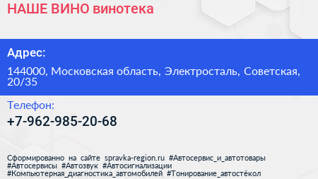 #НАШЕ ВИНО, винотека по адресу 144000, Московская область, Электросталь, Советская, 20/35 в дальнейшем Организация, размещена в следующих категориях: