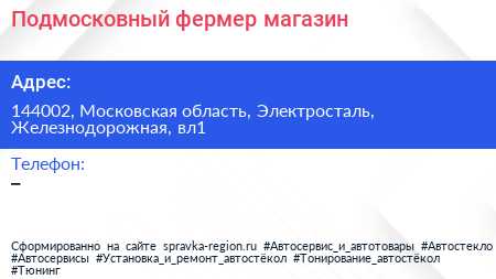 Подмосковный фермер, магазин по адресу 144002, Московская область, Электросталь, Железнодорожная, вл1 в дальнейшем Организация, размещена в следующих категориях: