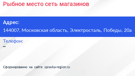 Рыбное место, сеть магазинов по адресу 144007, Московская область, Электросталь, Победы, 20а в дальнейшем Организация, размещена в следующих категориях: