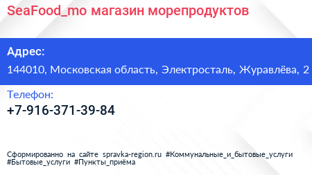 SeaFood_mo, магазин морепродуктов по адресу 144010, Московская область, Электросталь, Журавлёва, 2 в дальнейшем Организация, размещена в следующих категориях: