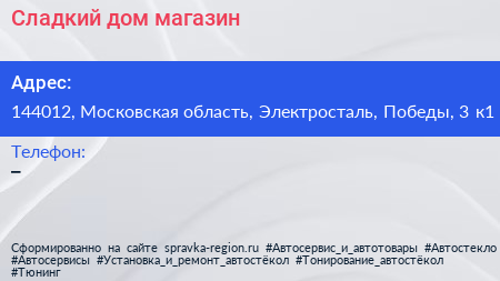 Сладкий дом, магазин по адресу 144012, Московская область, Электросталь, Победы, 3 к1 в дальнейшем Организация, размещена в следующих категориях: