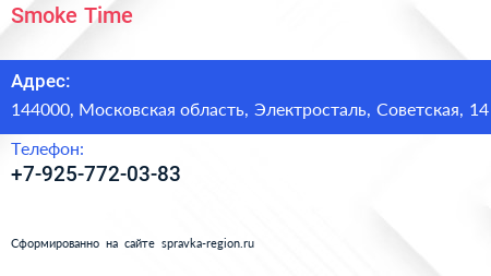 Smoke Time по адресу 144000, Московская область, Электросталь, Советская, 14 в дальнейшем Организация, размещена в следующих категориях: