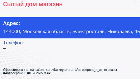 Сытый дом, магазин по адресу 144000, Московская область, Электросталь, Николаева, 4Б в дальнейшем Организация, размещена в следующих категориях:
