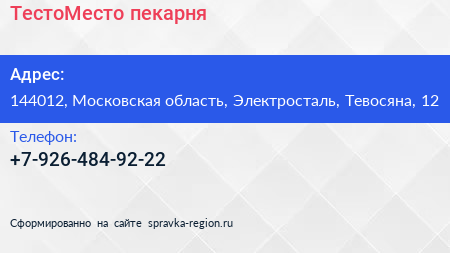 ТестоМесто, пекарня по адресу 144012, Московская область, Электросталь, Тевосяна, 12 в дальнейшем Организация, размещена в следующих категориях: