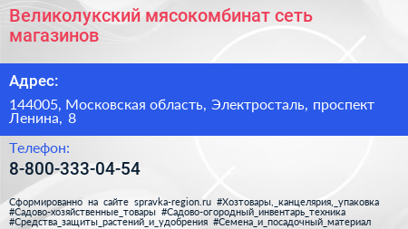Великолукский мясокомбинат, сеть магазинов по адресу 144005, Московская область, Электросталь, проспект Ленина, 8 в дальнейшем Организация, размещена в следующих категориях: