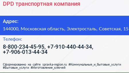 DPD, транспортная компания по адресу 144000, Московская область, Электросталь, Советская, 15 в дальнейшем Организация, размещена в следующих категориях: