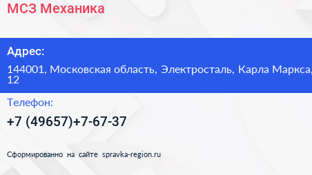 МСЗ-Механика по адресу 144001, Московская область, Электросталь, Карла Маркса, 12 в дальнейшем Организация, размещена в следующих категориях: