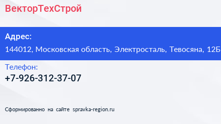 ВекторТехСтрой по адресу 144012, Московская область, Электросталь, Тевосяна, 12Б в дальнейшем Организация, размещена в следующих категориях: