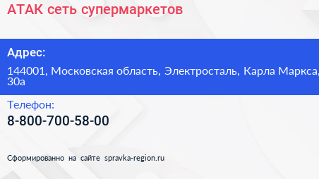 АТАК, сеть супермаркетов по адресу 144001, Московская область, Электросталь, Карла Маркса, 30а в дальнейшем Организация, размещена в следующих категориях: