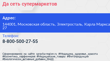 Да!, сеть супермаркетов по адресу 144001, Московская область, Электросталь, Карла Маркса, 27 в дальнейшем Организация, размещена в следующих категориях: