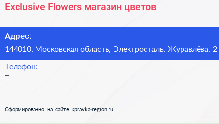 Exclusive Flowers, магазин цветов по адресу 144010, Московская область, Электросталь, Журавлёва, 2 в дальнейшем Организация, размещена в следующих категориях:
