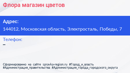 Флора, магазин цветов по адресу 144012, Московская область, Электросталь, Победы, 7 в дальнейшем Организация, размещена в следующих категориях: