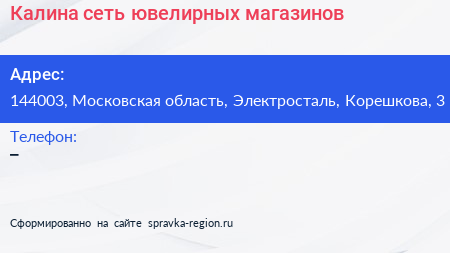 Калина, сеть ювелирных магазинов по адресу 144003, Московская область, Электросталь, Корешкова, 3 в дальнейшем Организация, размещена в следующих категориях: