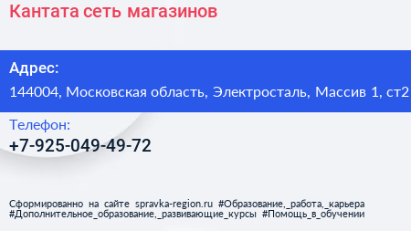 Кантата, сеть магазинов по адресу 144004, Московская область, Электросталь, Массив 1, ст2 в дальнейшем Организация, размещена в следующих категориях: