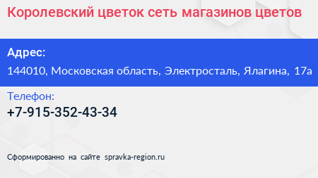 Королевский цветок, сеть магазинов цветов по адресу 144010, Московская область, Электросталь, Ялагина, 17а в дальнейшем Организация, размещена в следующих категориях:
