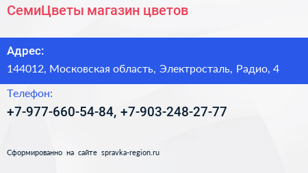 СемиЦветы, магазин цветов по адресу 144012, Московская область, Электросталь, Радио, 4 в дальнейшем Организация, размещена в следующих категориях: