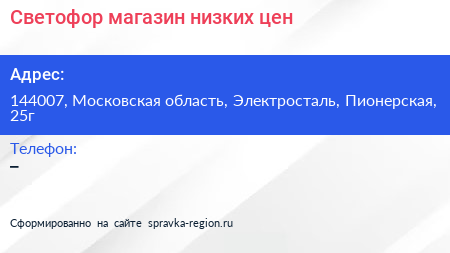 Светофор, магазин низких цен по адресу 144007, Московская область, Электросталь, Пионерская, 25г в дальнейшем Организация, размещена в следующих категориях: