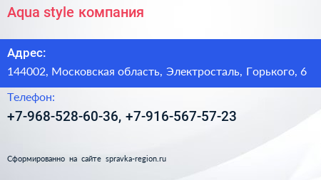 Aqua-style, компания по адресу 144002, Московская область, Электросталь, Горького, 6 в дальнейшем Организация, размещена в следующих категориях: