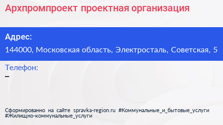 Архпромпроект, проектная организация по адресу 144000, Московская область, Электросталь, Советская, 5 в дальнейшем Организация, размещена в следующих категориях: