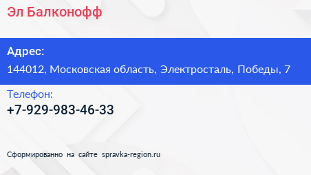 Эл-Балконофф по адресу 144012, Московская область, Электросталь, Победы, 7 в дальнейшем Организация, размещена в следующих категориях: