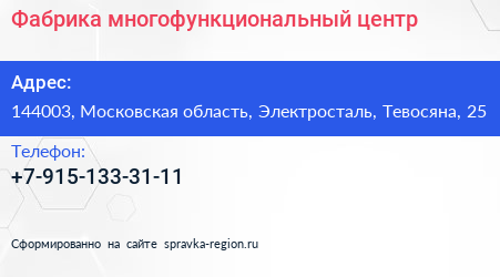 Фабрика, многофункциональный центр по адресу 144003, Московская область, Электросталь, Тевосяна, 25 в дальнейшем Организация, размещена в следующих категориях: