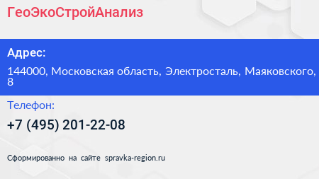 ГеоЭкоСтройАнализ по адресу 144000, Московская область, Электросталь, Маяковского, 8 в дальнейшем Организация, размещена в следующих категориях:
